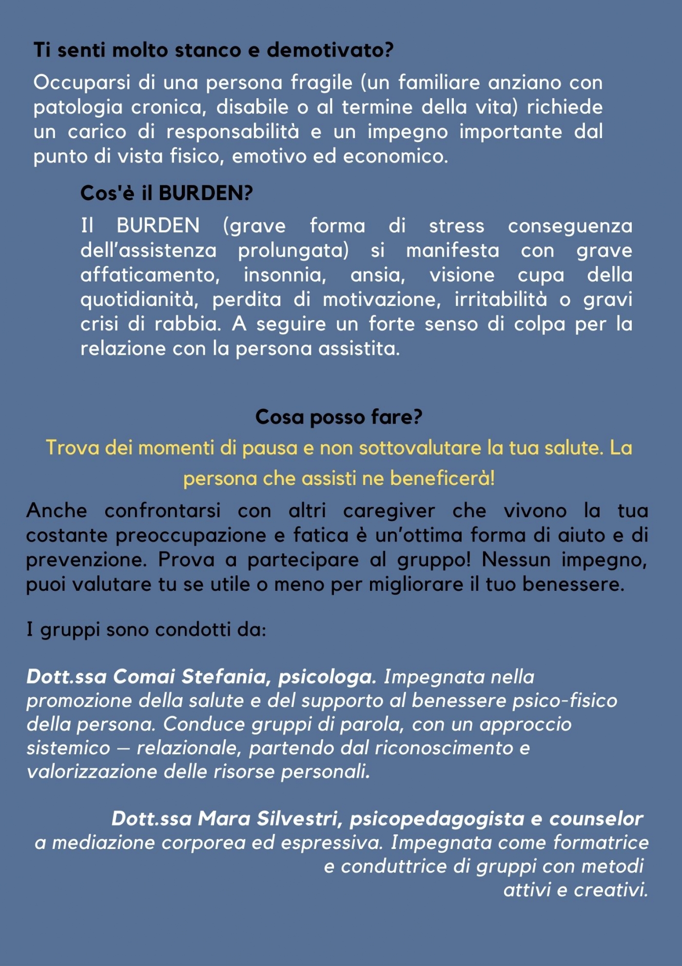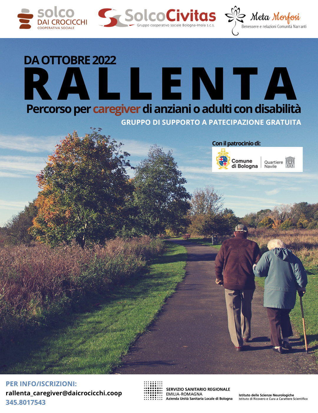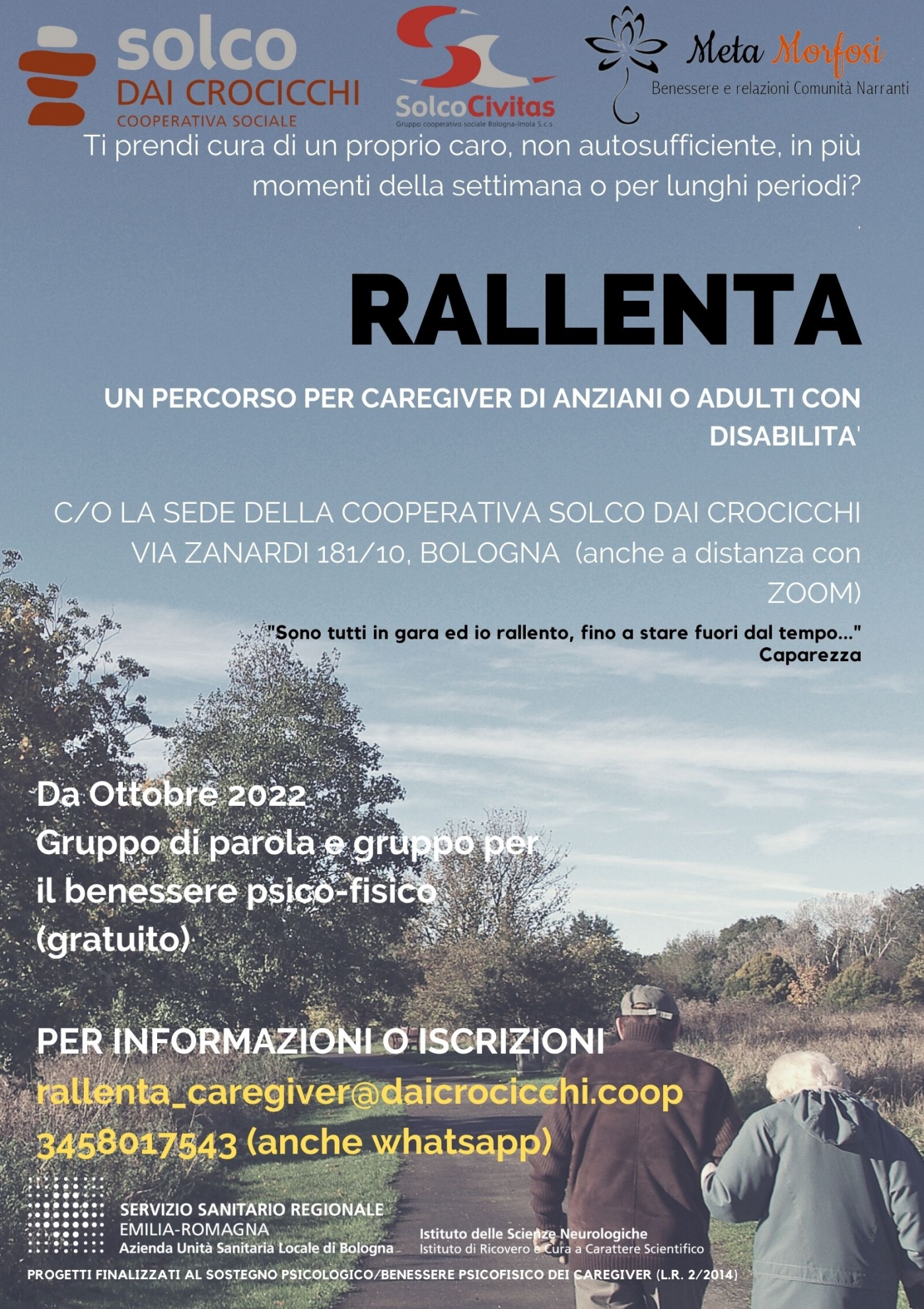 Da ottobre 2022, sarà attivo un gruppo di parola ed un gruppo per il benessere psico-fisico (con attività di riattivazione corporea) a sostegno di caregiver.Occuparsi di una persona fragile (un familiare anziano non autosufficiente, disabile o al termine della vita) richiede un carico di responsabilità e un grande impegno dal punto di vista fisico, emotivo ed economico.Previeni il BURDEN, una grave forma di stress conseguenza dell’assistenza prolungata.I sintomi sono: grave affaticamento, insonnia, ansia, visione cupa della quotidianità, perdita di motivazione, irritabilità o gravi crisi di rabbia. A seguire un forte senso di colpa per la relazione con la persona assistita.Trova dei momenti di pausa e non sottovalutare la tua salute. La persona che assisti ne beneficerà!Anche confrontarsi con altri caregiver che vivono la tua costante preoccupazione e fatica è un’ottima forma di aiuto e di prevenzione al BURDEN.A Bologna sono molte le realtà pronte a darti una mano. La Cooperativa Solco Dai Crocicchi assieme all’Associazione Meta-morfosi organizzano:Gruppo di parola: 10 incontri di sostegno co-condotti da una psicologa e una pedagogista. Potrai conoscere altre persone che, come te, vivono un’esperienza di cura di un familiare e, con il supporto di professioniste, trovare uno spazio dove poter dare voce ai tuoi bisogni (nella misura in cui avrai piacere di condividerli). Gruppo per il benessere psicofisico: 10 incontri di pratiche corporee leggere e creative dove il corpo sarà al centro dell’esperienza nella sua espressività e presenza, migliorando così la gestione dello stress e la qualità di vita.Non puoi partecipare in presenza? Chiamaci potrai farlo a distanza attraverso la nostra piattaforma di zoom, comodamente da casa tua.I gruppi sono condotti dalla dott.ssa Comai Stefania e dalla dott.ssa Mara Silvestri.La partecipazione è totalmente GRATUITA.Scrivici o chiamaci (anche whatsapp) senza impegno: