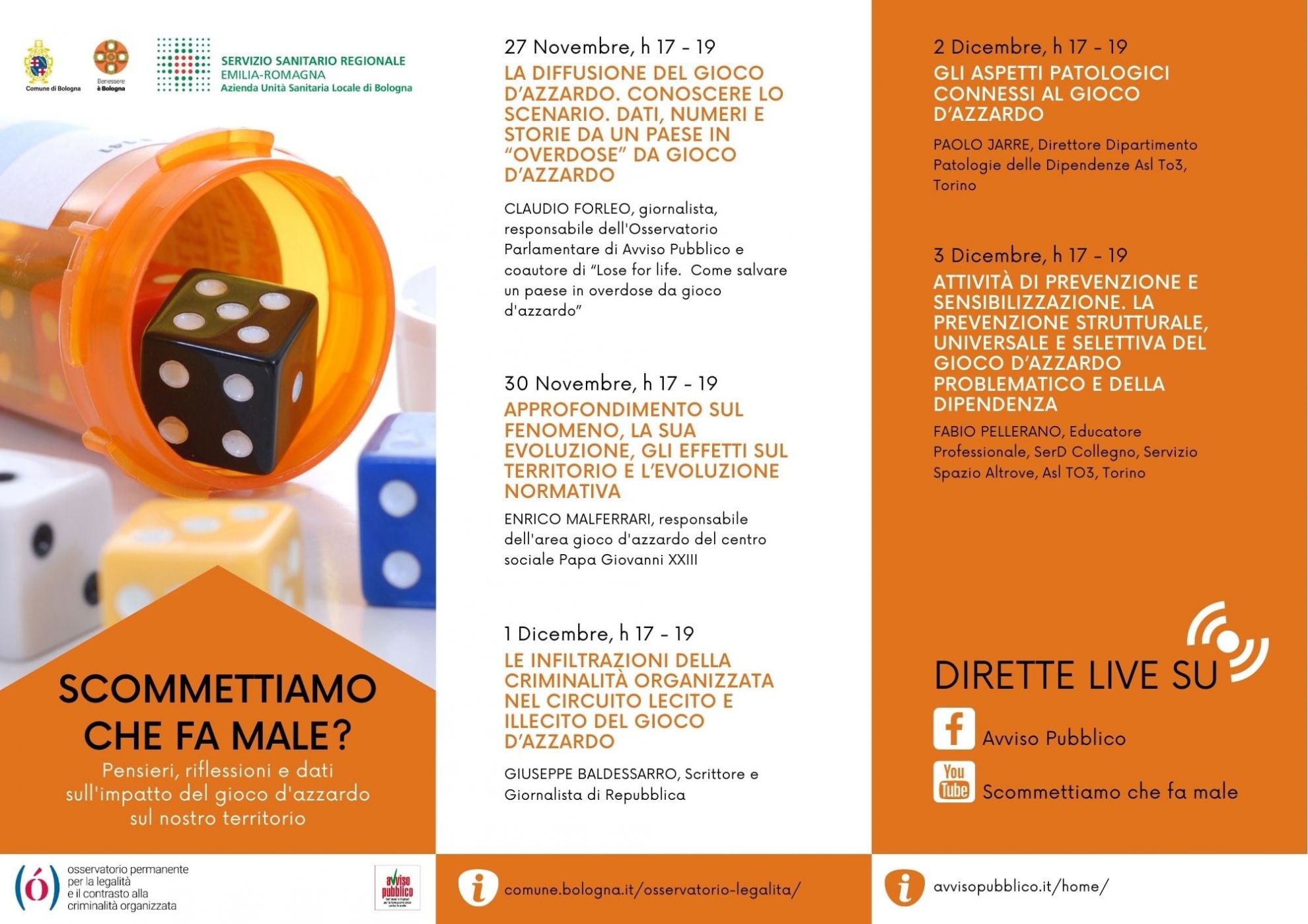 Nell'ambito delle azioni di prevenzione e sensibilizzazione sulle conseguenze del gioco d'azzardo promosse dal Comune di Bologna, un nuovo ciclo di incontri di formazione "Scommettiamo che fa male" a cura di Avviso Pubblico. La rete nazionale degli Enti Locali Antimafia, che si svolgerà dal 27 novembre al 3 dicembre in modalità on line